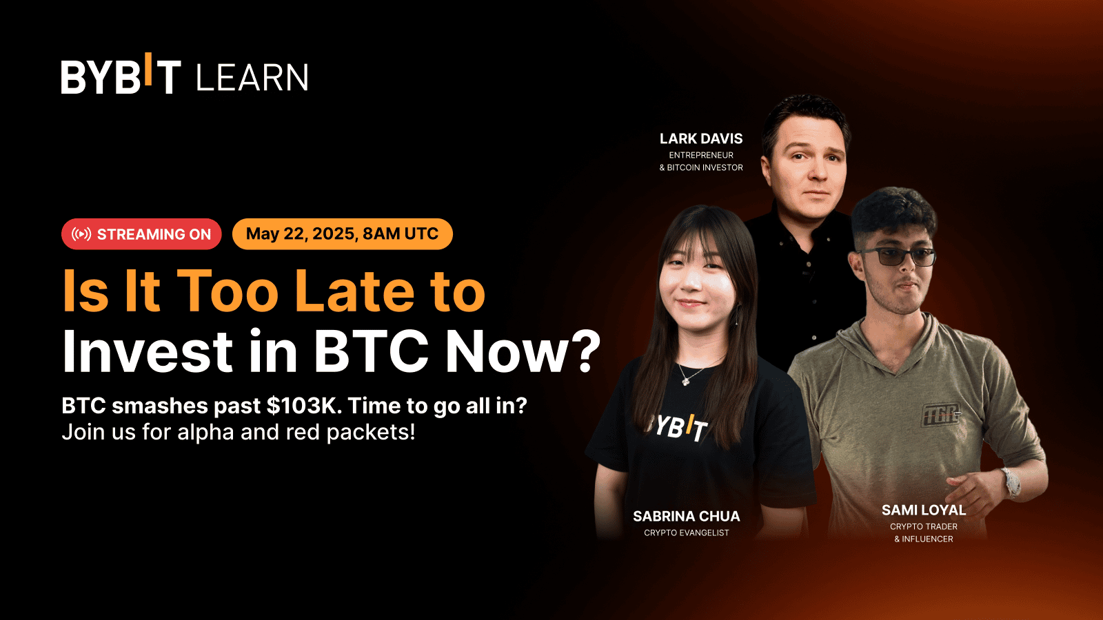 Joining the livestream on May 22, 2025, were two distinguished guests: Lark Davis, entrepreneur and Bitcoin investor, and Sami Loyal, crypto trader and influencer. Under the moderation of Sabrina Chua, Senior Content Strategist at Bybit, this episode explores Is It Too Late to Invest in BTC?